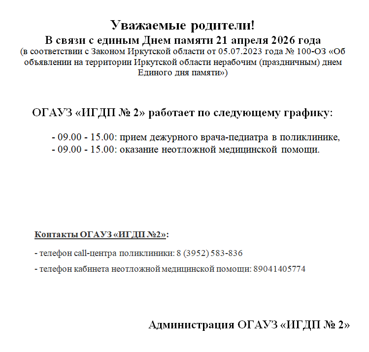 Телефона "горячей линии" по записи на приём к врачу: Единый номер 122 доб. 4 Лекарственное обеспечение: Единый номер 122 Горячая линия МО : c.т: 89149455679, e-mail:adm@irkgdp2.ru По вопросам COVID19: 8 (3952) 43-88-71 ; 8 (3952) 39-99-99 (Единый номер 122) Телефон неотложной помощи: 89041405774